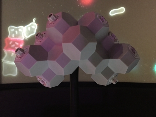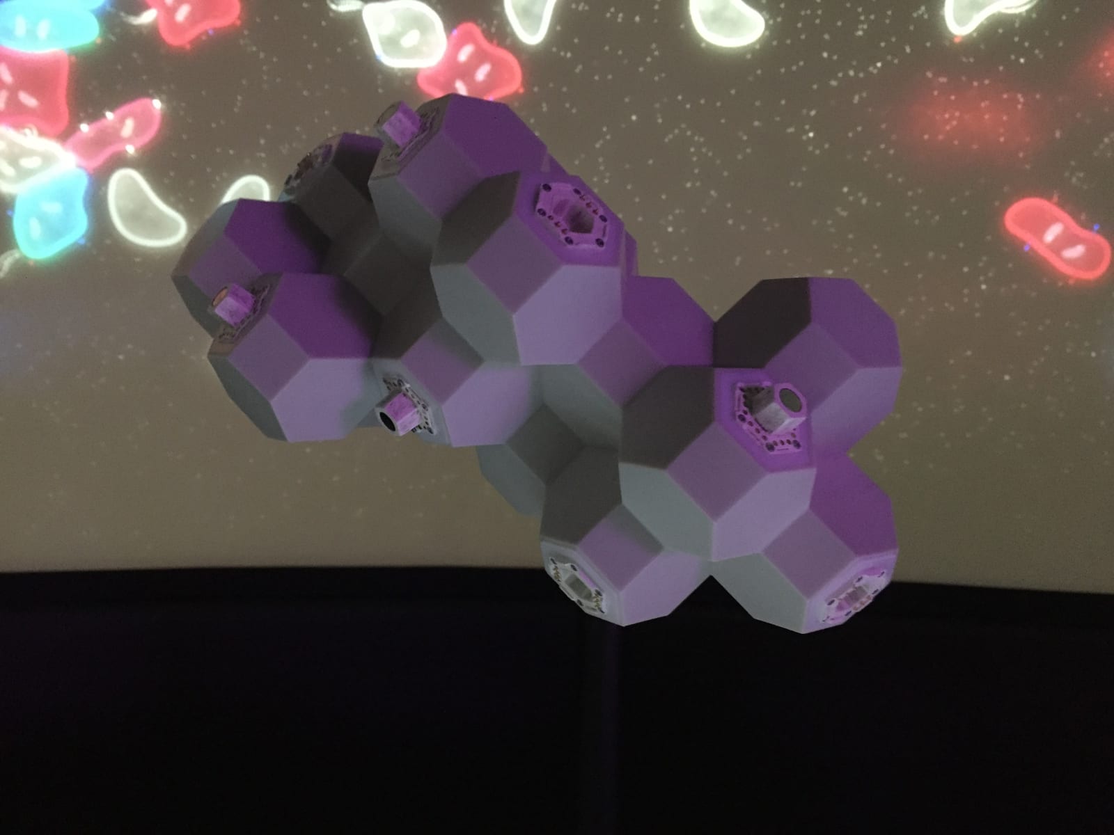 The goal of Creature Creation Station is to give visitors a design challenge based introduction to the fundamentals of synthetic biology. Visitors mix and match a kit of tangible building blocks with specific functions (that represent real-world DNA parts) to program and explore how biological circuits are constructed. Final creature designs live and interact in the immersive simulation space.